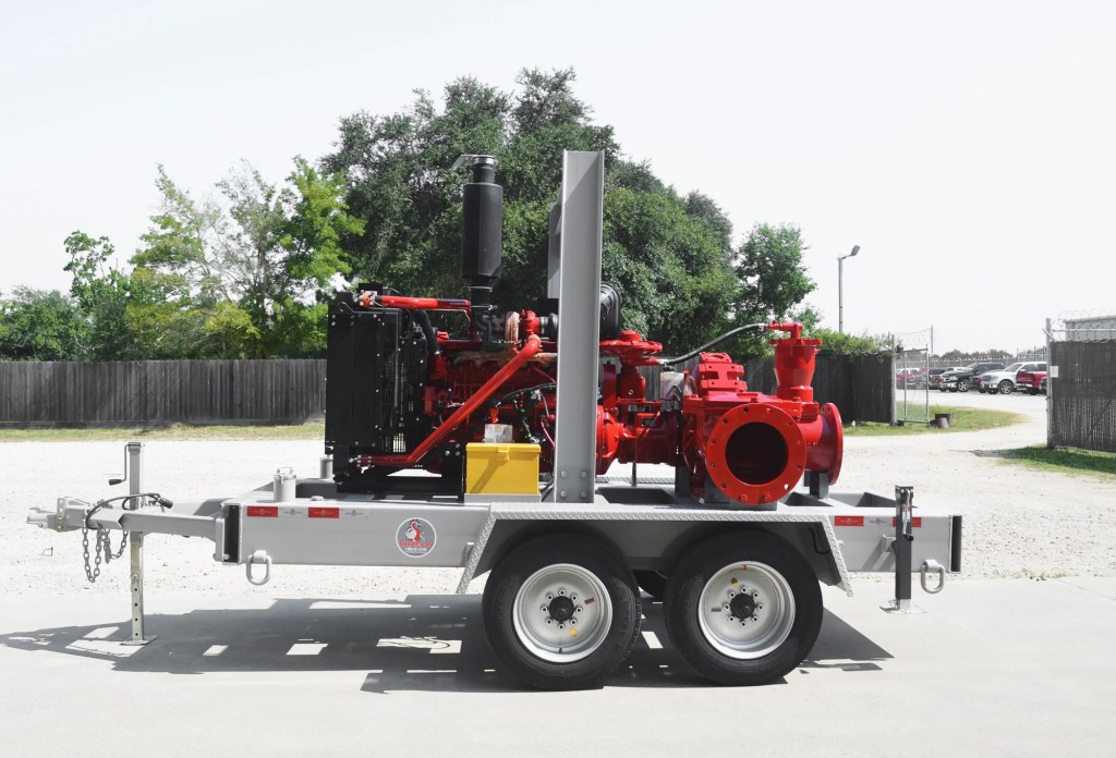 Our Mobile Pumps are easily moved to locations where large amounts of water must be pumped. For pumping where space is limited such as dams, can be equipped with a 180° turntable mechanism to allow for maximum maneuverability in tight situations. Everything you need is mounted on an over-the-road trailer including the diesel engine, water pump, fuel tank, hydraulic oil reservoir, rigid discharge pipe, flexible discharge hose, and a complete safety shutdown system.